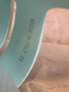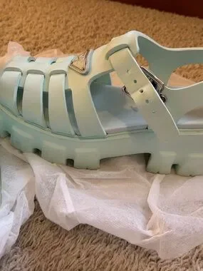 Chunky fisherman sandal silhouette. Mint green rubber upper with woven straps. Platform lug sole for bold lift. Adjustable ankle strap with buckle. Triangular Prada logo plaque on vamp.