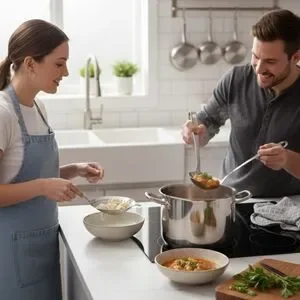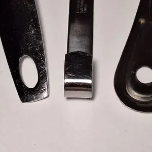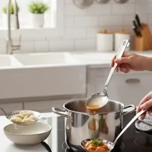 The Stainless-Steel Kitchen Tools Set of 3 Pcs includes a ladle, skimmer, and spoon, all made of high-quality stainless steel with a solid silver color. The set is designed by well-known brands like Onieda and Farberware, making it a reliable and durable addition to any kitchen. The tools are perfect for cooking and serve a practical purpose in the kitchen, making meal preparation easier and more efficient.