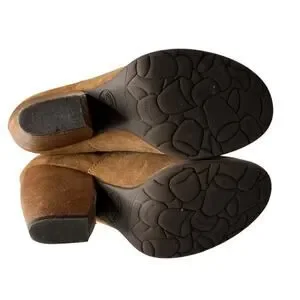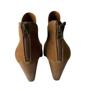 Korkease Castaneda Suede Bootie in Rust. Size 7.5. Features round toe, block heel, petal-shaped shaft, mixed-media leather upper, cushioned leather footbed, and back zipper closure. Style K42626. Excellent pre-owned condition.