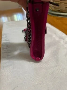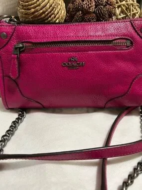 Compact Coach crossbody in vibrant hot pink pebbled leather. Front zip pocket and gunmetal hardware. Chain-and-leather strap for hands-free wear. Sleek, bold style for day-to-night outfits.