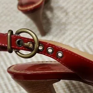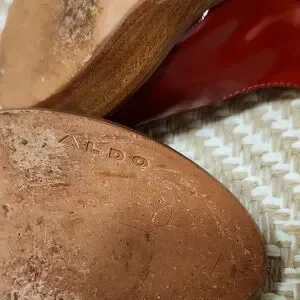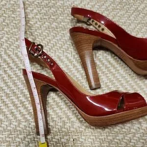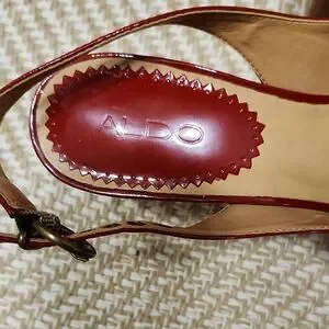The Aldo Red Patent Leather Peep Toe Slingback High Stacked Heel Sandal is a stylish and elegant choice for any party or cocktail event. With a solid red color and a platform style, these sandals feature a thin stacked wooden heel, perfect for adding a touch of sophistication to your outfit. Made from real leather, these size 7 sandals are designed for the fashion-forward woman looking to make a statement with her footwear.