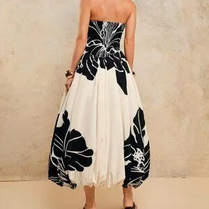 Elegant black and white ruched printed maxi dress for a banquet, featuring a strapless, sleeveless design with a slim fit and A-line silhouette.