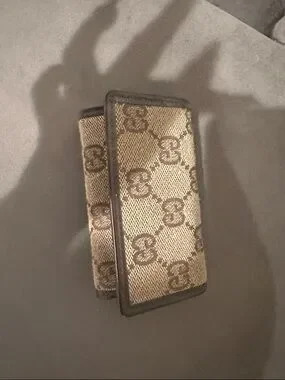 Compact monogram canvas key holder. Beige and brown woven pattern with brown trim. Slim and easy to carry.