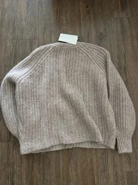 Soft chunky knit V-neck cardigan in a versatile beige color. Features button-front closure and relaxed balloon sleeves for a comfortable, on-trend look. Lightweight yet warm layering piece that pairs easily with jeans or skirts. Beige adds a neutral, elegant touch to any outfit. Brand new with tags size small.