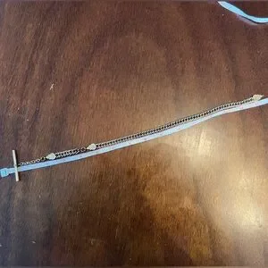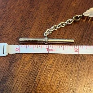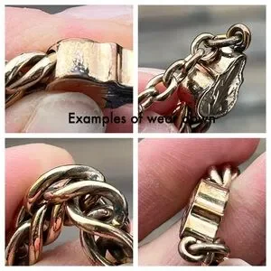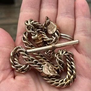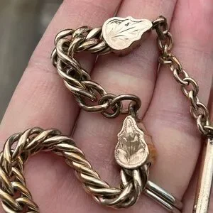 A beautiful and hefty antique watch chain weighing 62 grams. This piece features 3 decorative leaf shaped end caps and one T-Bar. The curb chain is approx 3/8” or 8mm across. Length is 15.5” from edge of t-bar to other end. The end piece bail is approx 3mm across.