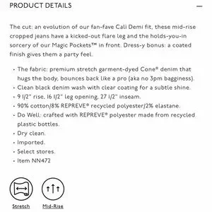 The cut: an evolution of our fan-fave Cali Demi fit, these mid-rise cropped jeans have a kicked-out flare leg and the holds-you-in sorcery of our Magic Pockets™ in front. Dress-y bonus: a coated finish gives them a party feel.