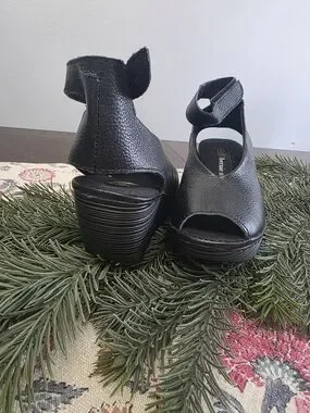 Stunning in person, the Mely is absolutely beautiful featuring a classic black base but with a pebbled grain texture in an open-toed design with a peep heel and velcro ankle strap atop a black textured wedge to elevate your style. The sole is made from memory foam so you'll feel like you're walking on clouds.