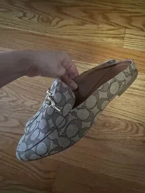Coach slip-on mules in signature jacquard print. Neutral beige and tan tones with a gold-tone bit accent. Leather-lined footbed for comfortable wear. Elegant, versatile style for everyday or dressier looks.