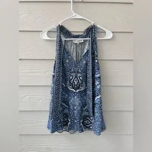 Sleeveless blouse with a blue paisley print. V-neckline with tie and relaxed fit. Lightweight, flowy fabric for easy layering. Versatile for casual or dressy looks.