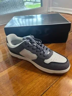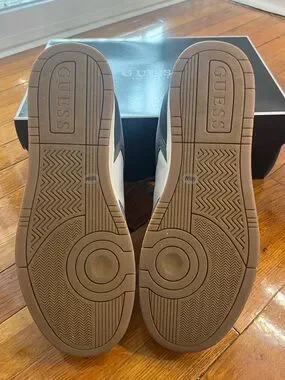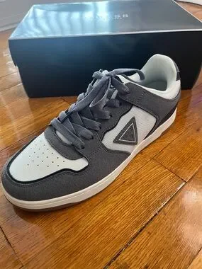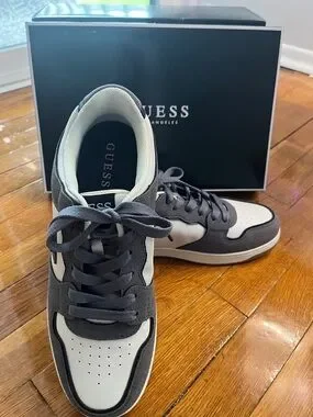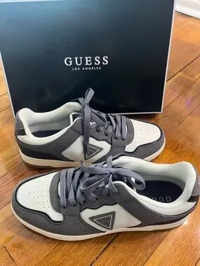 GUESS low-top sneakers in gray suede and white leather panels. Lace-up closure with signature triangular logo on the sides. Clean, versatile look for everyday wear.