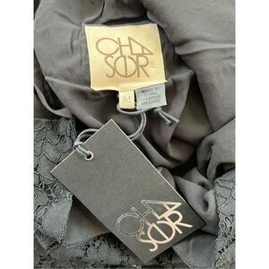 New with tags! Black floral lace dress from Chaser. Deep v neckline, strappy back, and scallop hem with eyelash trim. Lined about 3/4 of the way down.