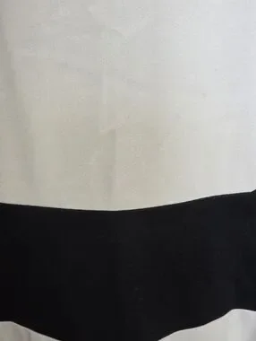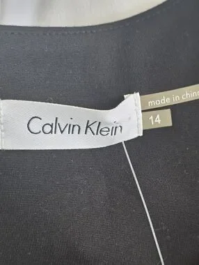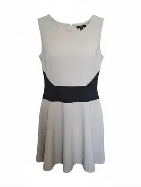 Sleeveless fit-and-flare dress by Calvin Klein. Light gray body with a bold black waistband that defines the waist. Clean neckline and smooth skirt for a polished look. Minimalist style for versatile occasions.