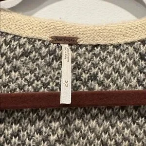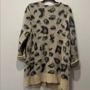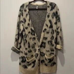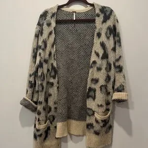 Free People open-front cardigan with leopard print. Cream base with gray spots. Two front pockets for convenience. Soft textured knit for layered looks. Worn 1 time, smoke free home , PTP - 24 inches .