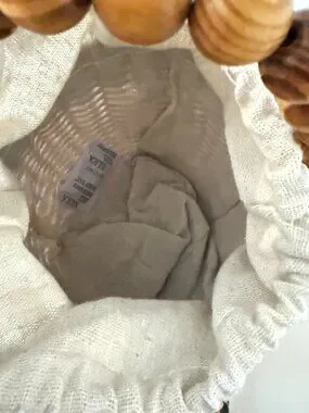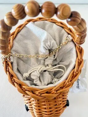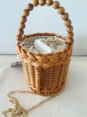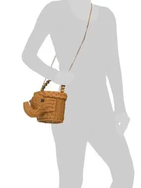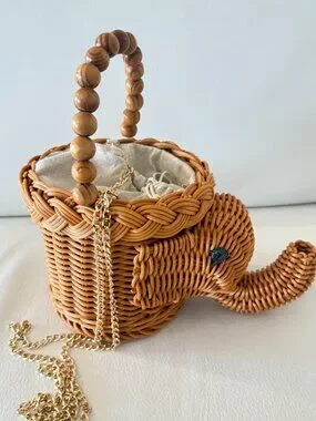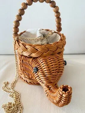 elephant shape, gold tone chain shoulder strap, wooden carry handle, fully lined interior, woven basket design
