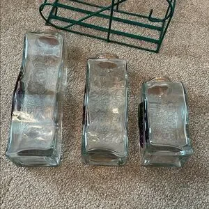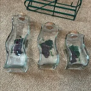 Three decorative glass bottles with cork stoppers. Painted grape cluster design on each bottle. Comes with a green metal carrying stand. Stylish kitchen or tabletop accent. Tallest glass bottle is 10 inches tall with cork middle bottle is 8 inches with cork and smallest bottle is 6 inches with cork.
