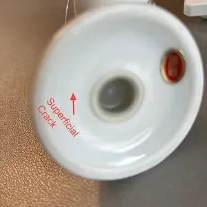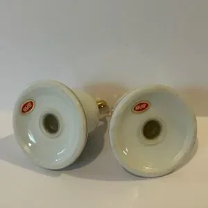Disneyland Walt Disney Productions salt and pepper shakers feature a charming bell shape crafted from white ceramic with elegant gold-tone accents. One shaker depicts the iconic Sleeping Beauty Castle in vibrant shades of blue, purple, and green, while the other showcases a classic red and white striped carousel with golden horses. Both pieces are finished with a heart-shaped gold handle and fine gold trim around the base. The reverse side includes the Disneyland logo and "© Walt Disney Productions" in gold lettering, along with decorative perforations. These vintage-inspired table accessories are marked with "Japan" stickers on the bottom.**See pictures for superficial crack**