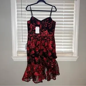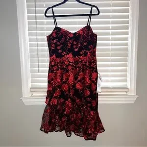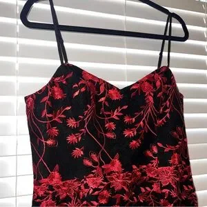 Perfect for any formal occasion or party. The black and red floral pattern is eye-catching and the sweetheart neckline adds a touch of elegance. The zip closure makes it easy to wear and the knee-length fit and flare style is flattering on any body type. Made from high-quality chiffon fabric, this dress is both comfortable and luxurious. Adjustable straps. Sleeveless. Fit and flare. Romantic, flirty. Prom / homecoming / wedding guest / evening attire / Valentine's Day / date night