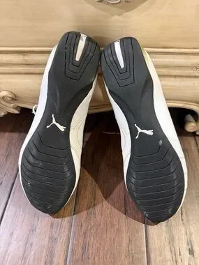 Elevate your street style with these sleek Puma x Scuderia Ferrari Future Cat motorsport sneakers. These low-profile driving shoes feature a clean white leather upper with the iconic Ferrari shield and asymmetrical lacing for a precision fit. Perfect for car enthusiasts or anyone looking for a streamlined, sporty look.