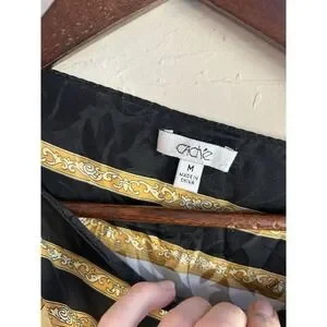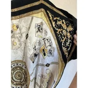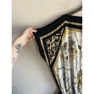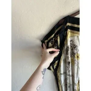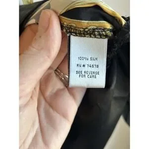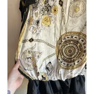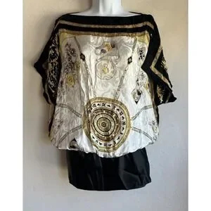 Beautiful 100% silk blouson tunic top by Cache featuring a unique and eye-catching novelty print with teapots, teacups, and Earl Grey tea motifs combined with baroque chain and clock elements in black, gold, and ivory tones. Vintage silk scarf inspired draped top.
