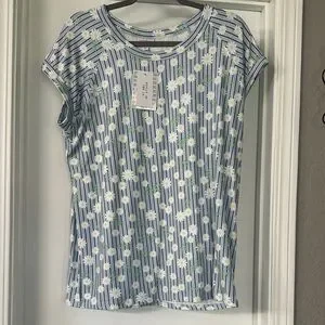 Light blue tee with vertical navy stripes. Scattered white daisy print with green centers. Short sleeves and round neckline. Breezy casual top with feminine floral pattern.