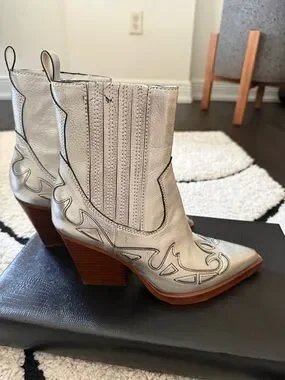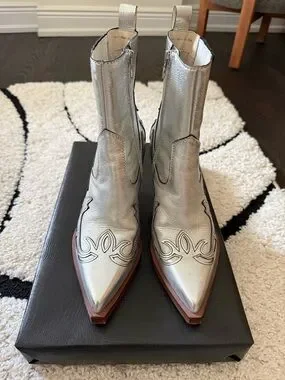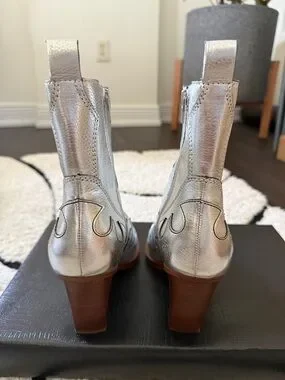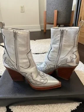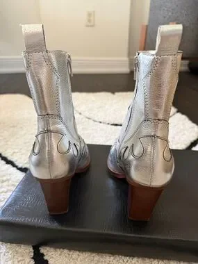 Metallic silver Western-style ankle boots with pointed toe and decorative stitching. Smooth leather-look upper with side zippers for easy on and off. Sleek silver finish adds bold, fashion-forward shine to outfits.worn 1 time.