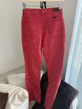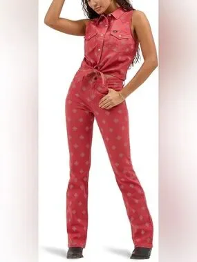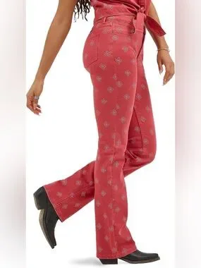 Stylish red bootcut jeans with a subtle all-over diamond print. Comfortable mid-rise fit with classic five-pocket styling. Flattering bootcut leg that pairs well with boots or heels. Easy-care fabric for everyday wear.