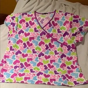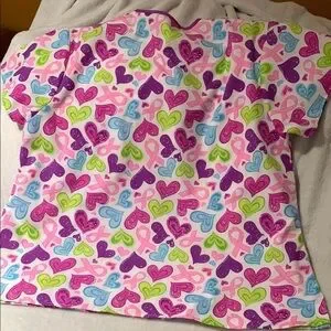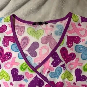 BNWOT Vibrant Scrub Top heart print in pink, purple, and green, with Pink Cancer Ribbon. Beautiful