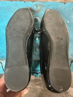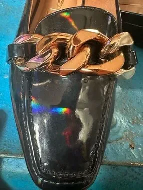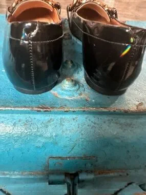 Vizzano black patent loafers with a striking gold chain across the vamp. Sleek slip-on silhouette with a glossy finish for polished everyday wear. Lightly cushioned insole for comfortable all-day use. Elegant black patent and gold hardware pair well with both casual and dress looks. Never worn just tried on.