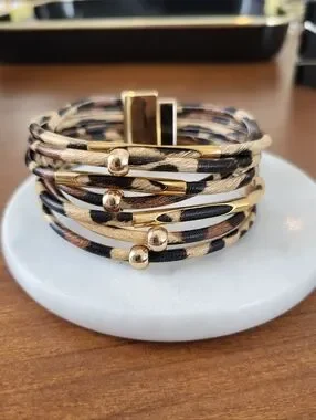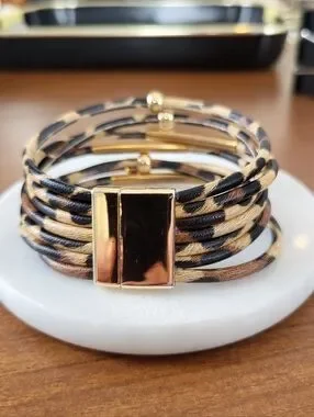 Stylish multi-strand bracelet featuring brown animal-print cords and gold accents. Lightweight and flexible for comfortable all-day wear. Adds a chic, on-trend touch to casual and dressy outfits. Gold and brown coloring complements warm-toned jewelry.