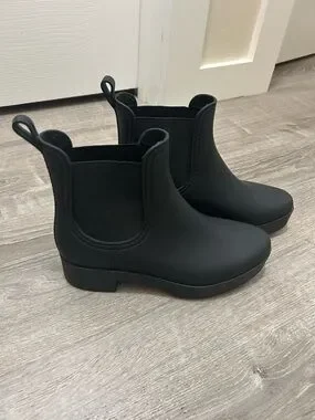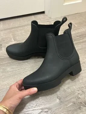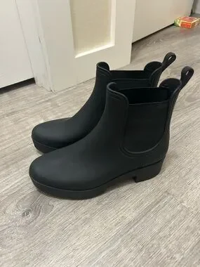 Super cute! Sleek Chelsea-style ankle boots by Jeffrey Campbell. Waterproof matte upper with elastic side panels. Pull tabs for easy on and off. Chunky low heel for stable wear. Minimal, modern silhouette. Like new! Barely worn a minute! Perfect MINT condition! I bought them and realized they are too small for me. They are a size 38 or 7.5 and I’m clearly a 39/40 or an 8 in these boots! So size up! If you’re a 7 or 7.5 these would fit great with socks! If you’re an 8 they are too tight! My loss your gain!