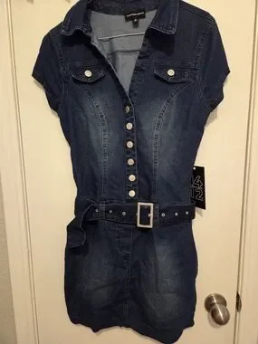 Classic denim dress in a dark navy wash. Front flap pockets and metal buttons. Structured collar and timeless styling.