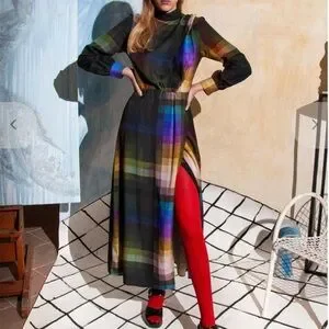 Elegant long sleeve maxi dress in a multicolor plaid pattern. Features a high neckline and gently gathered waist for a flattering silhouette. Lightweight, flowing fabric offers comfortable all-day wear. Perfect for daytime events and polished casual looks.