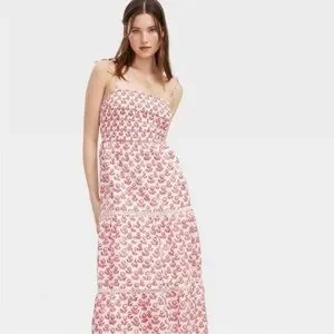 A breezy pink floral maxi dress with a smocked bodice and adjustable tie straps. Lightweight fabric with tiered skirt for effortless movement. Feminine pink print perfect for warm-weather occasions.