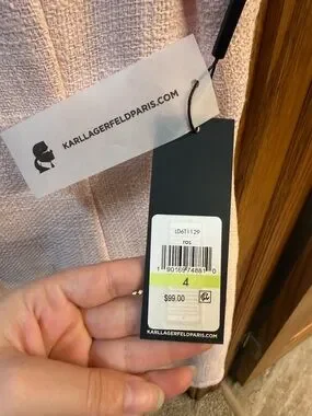 Karl Lagerfeld garment shown with black brand label. Soft light pink lining. Tweed trim with textured fringe. Never been worn. Tags attached.