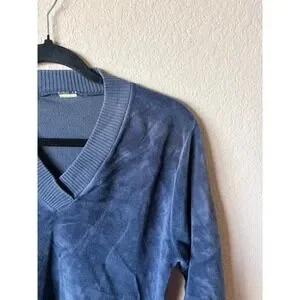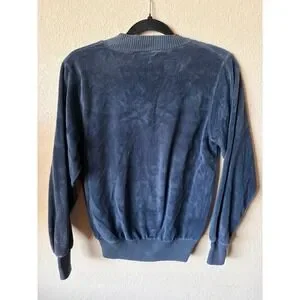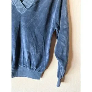 Vintage Velour V-Neck Pullover Sweater Blue Ribbed Trim Blouson XS Top Womens