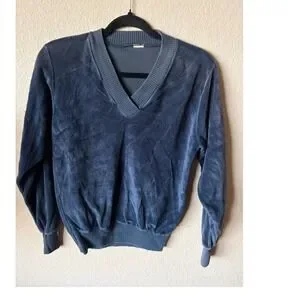 Vintage velour pullover sweater in a deep slate blue hue. This soft, plush top features a classic V-neckline with ribbed trim that coordinates with the elasticized cuffs and hem for a tapered, blouson fit. The fabric has a rich, velvety texture that catches the light beautifully, offering a cozy yet elevated aesthetic perfect for layering or wearing as a statement piece. Its retro silhouette and comfortable feel make it a versatile addition to any vintage-inspired wardrobe.