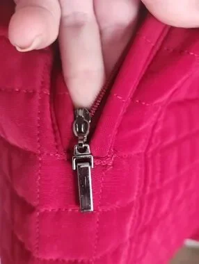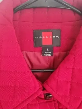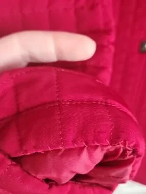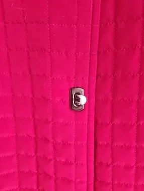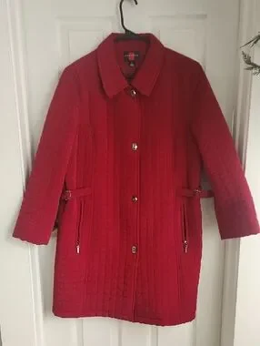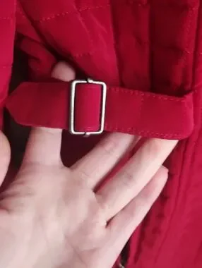 Quilted coat in vibrant red. Classic fold-down collar with secure button front. Vertical and diamond quilting for subtle texture. Zip front pockets and side buckle details. Straight hem and long sleeves for full coverage.