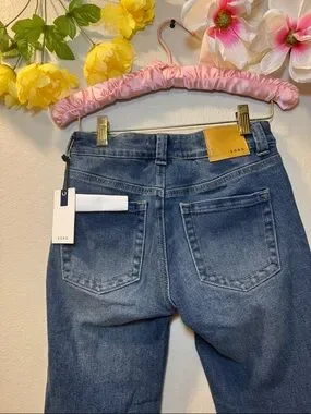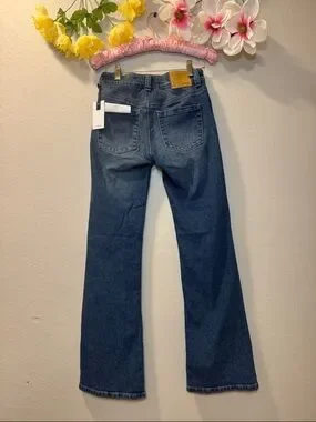 Dark blue flare jeans designed for a flattering silhouette. Features front patch pockets and a mid-rise waist for comfortable wear. Flexible denim with subtle wash for easy styling. Ideal dark blue color pairs well with casual and dressier tops.