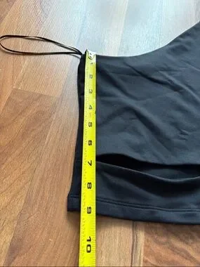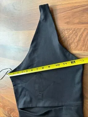 Asymmetrical one-shoulder design in solid black. Smooth, stretchy fabric for a fitted silhouette. Minimal, modern look great for day or night styling.