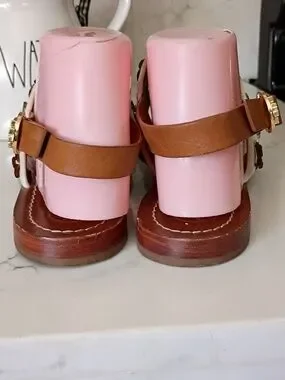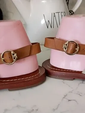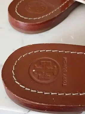 TORY BURCH Handcrafted Brown Leather Slide Sandals with Blue Embroidered Flower
