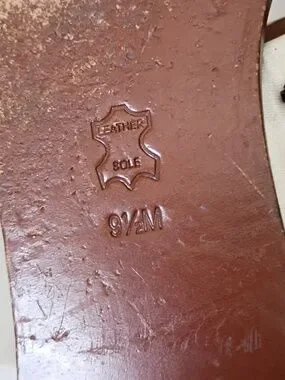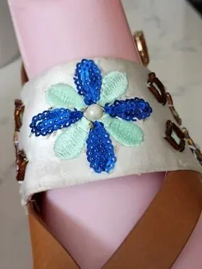 Handcrafted brown leather sandals with a blue and mint embroidered flower accent. Comfortable crisscross straps and a soft upper provide easy on-and-off wear. Decorative beading adds a unique, artisanal touch.