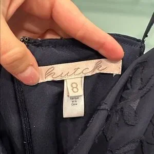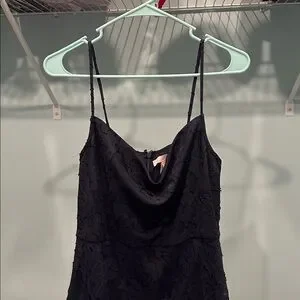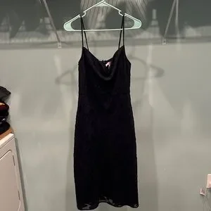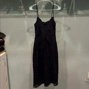Chic navy midi dress with lace overlay. Features spaghetti straps. Perfect for elegant occasions.