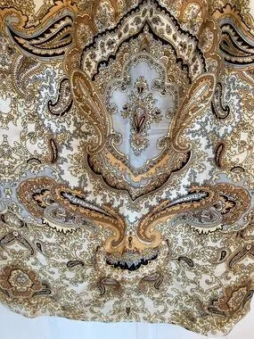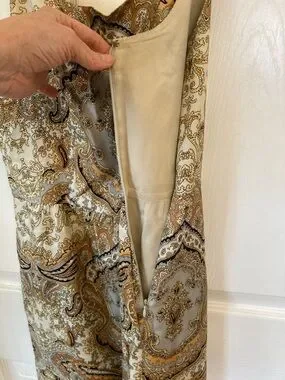 Tailored sleeveless midi sheath with an ornate paisley motif. Rich gold accents contrast on a cream base. Sleek silhouette for polished events. Style with simple accessories to let the pattern stand out. Side zipper and side pockets. Low back.