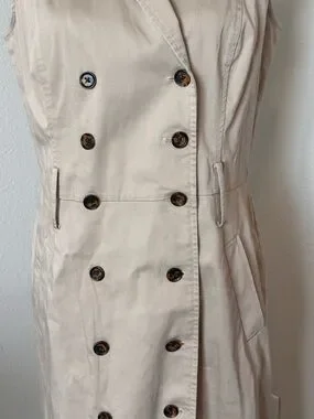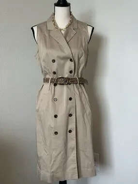 Sleeveless double-breasted trench dress by Banana Republic. Notch lapel and front pockets. Cinched waist with leopard-print belt. Classic beige tone for easy styling.