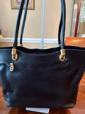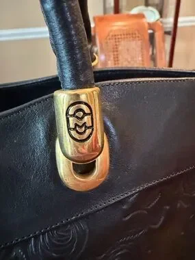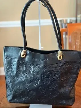 Marino Orlandi leather tote with embossed rose motif. Features dual top handles and gold-tone hardware. Structured silhouette for everyday use. Elegant, versatile design that pairs with many looks.