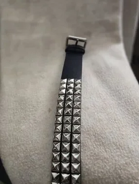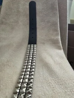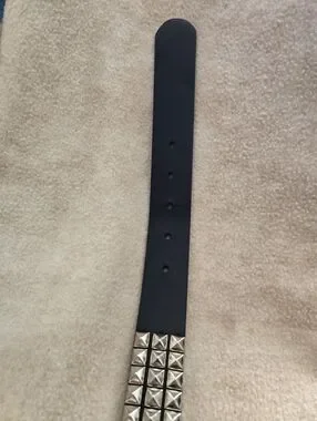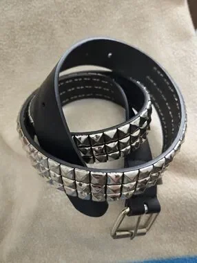 Classic black belt with three rows of silver pyramid studs. Durable hardware and a secure buckle. Sleek, edgy style that pairs well with casual and rock-inspired outfits. NOT leather, man-made sy thetiv leather. Only wore a couple times, excellent condition. #punk #goth #metal #streetcore