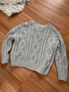 Pale gray cable knit sweater with a classic crew neckline. Features diamond and braided cable stitch details. Relaxed fit with ribbed hem and cuffs. Soft, cozy knit for everyday wear.