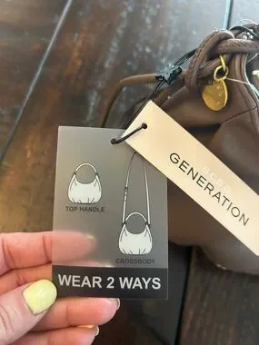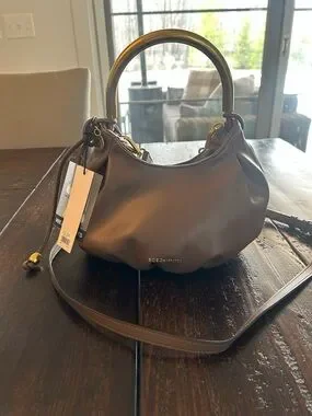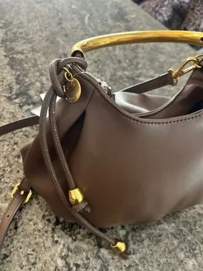 BCBGeneration Chocolate Faux Leather Metal Handle Hobo Shoulder Bag.The bag is characterized by its soft, slouchy "hobo" silhouette and a distinctive rigid metal handle. It features:Material: Chocolate brown faux leather (synthetic).Design: Magnetic-snap closure with a removable and adjustable shoulder strap for crossbody wear.Dimensions: Approximately \(9.75" \text{ W} \times 7.5" \text{ H} \times 4.25" \text{ D}\).Inspiration: The design is highly reminiscent of the luxury Chloé