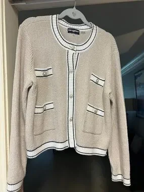Karl Lagerfeld Beige Knit Cardigan with Black & White Trim