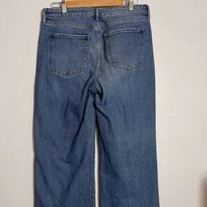 Old Navy Extra High-Rise Sky-Hi Wide Leg Jeans w/ Secret Smooth Pockets - A roomy wide leg with a long silhouette, extra high waisted, zip fly. Lightly worn dark wash jeans in great condition. Extra high waist is 1" higher than standard high rise, sits above belly button. Secret-smooth front pockets hold you in